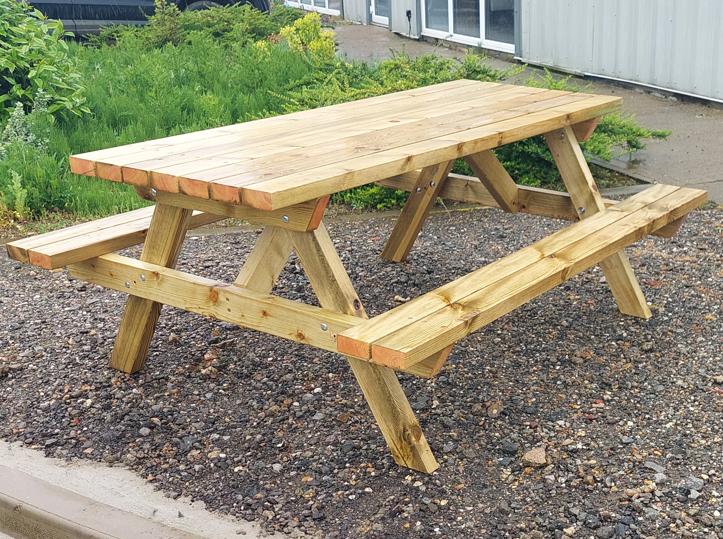 Our very popular strong and solid quality A frame picnic table is not only great value for money it has been manufactured from C24, structural grade 100x47mm timber which has been pressure treated.
