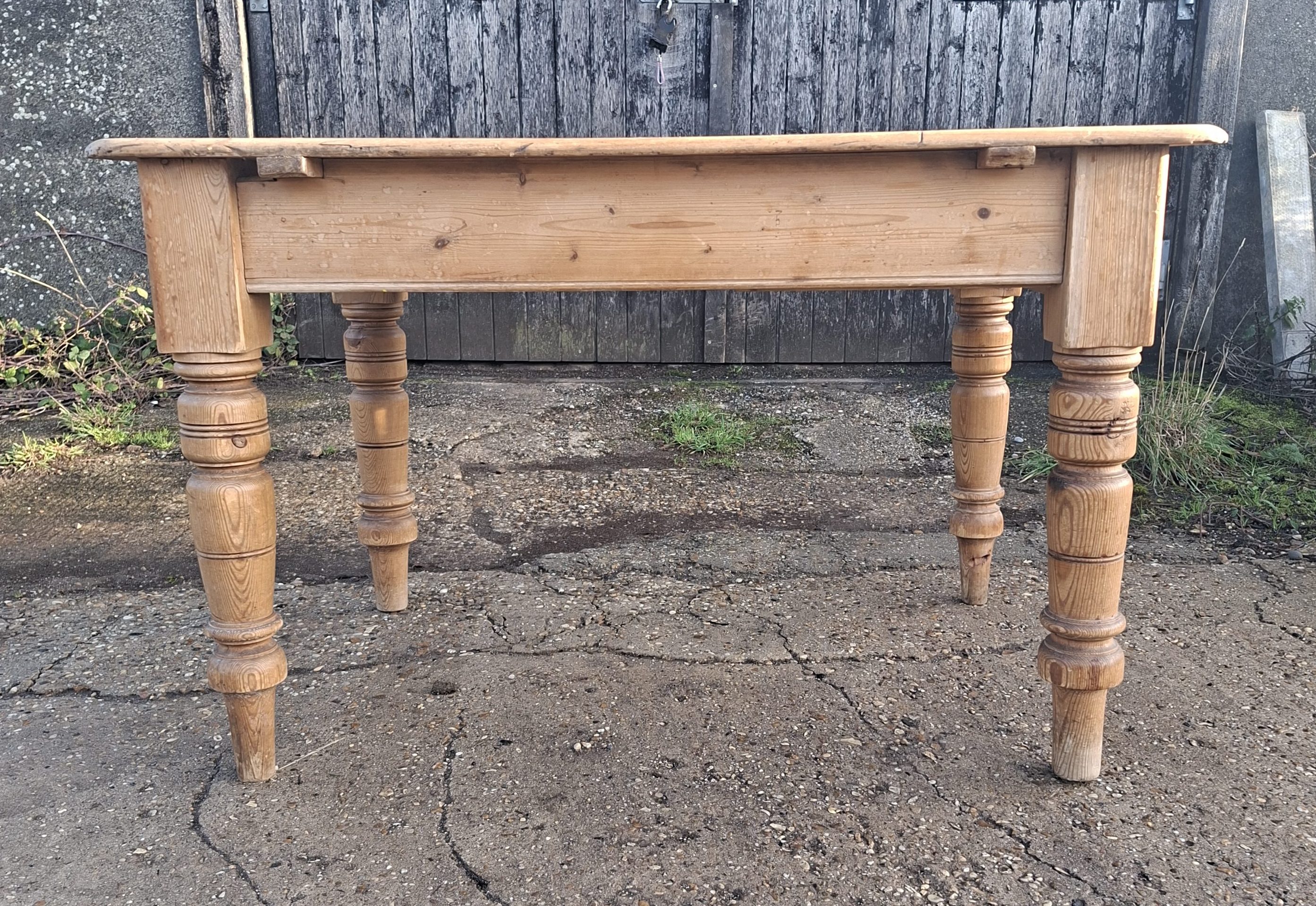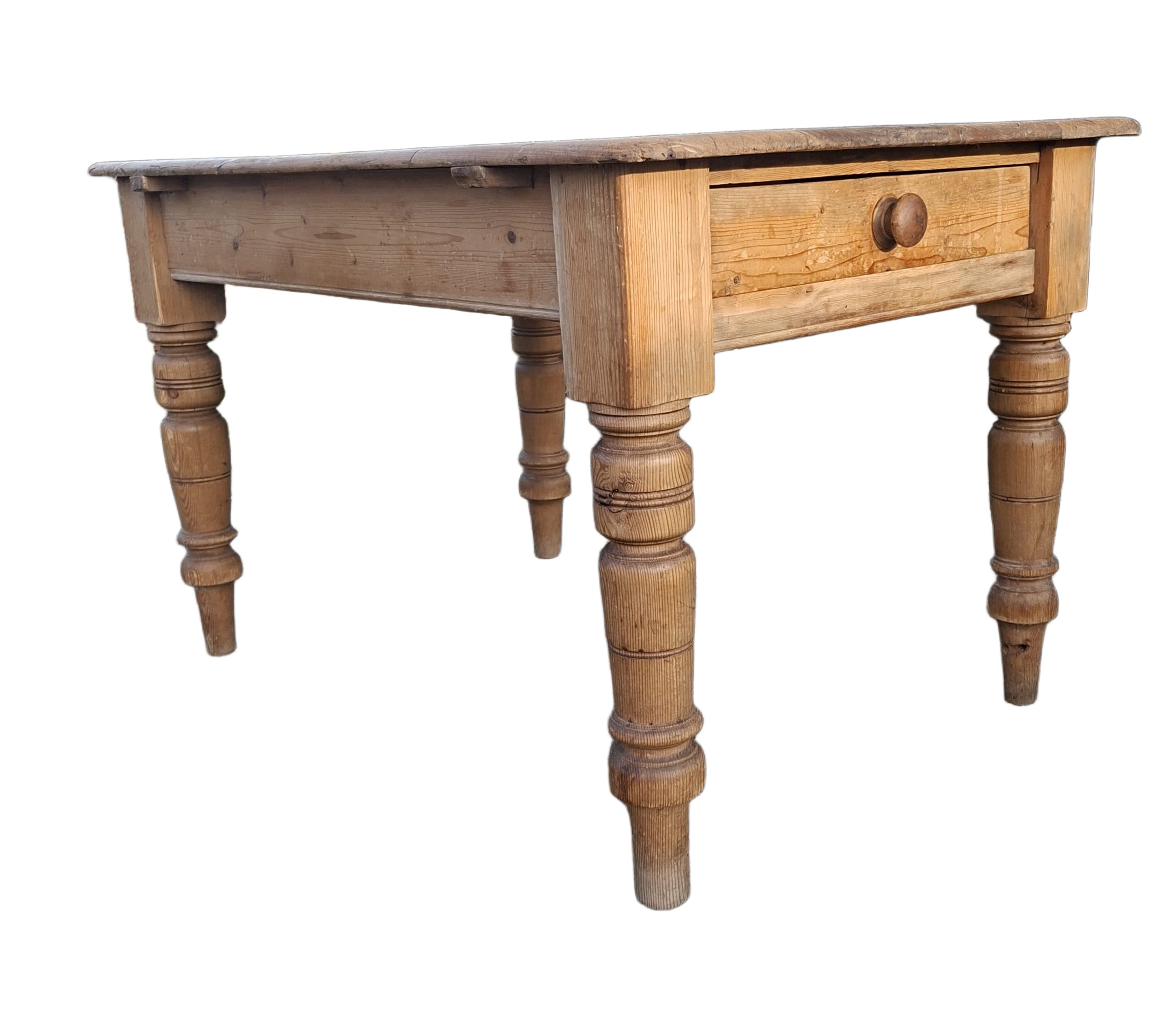 Good colour and patination throughout, solid pine table. Over-sailing plank top, turned leg base. Solid & sturdy throughout, single drawer.